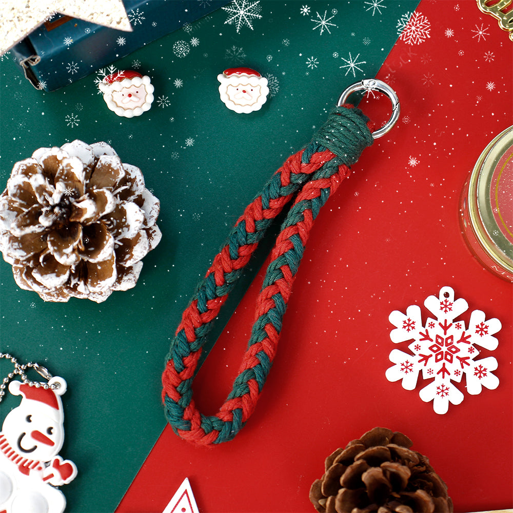 his Christmas 8-Strand Keychain/Wristband Weaving Kit (Macrame Kit) is a top choice for zero-based beginners and DIY lovers to create Christmas-themed items! Material details are standardized and complete: core materials include 2 colors of polyester weaving rope (3m each, total 6m), exclusive red & dark green Christmas color scheme, visually striking and full of festive atmosphere; polyester is tough and non-pilling, with tight and three-dimensional 8-strand texture after weaving, supporting keychain load-bearing and wristband durability. Accessories fit scenarios—1 spring clasp (designed for keychains, smooth opening and closing non-rusting, stable for hanging keys and access cards), 1 phone clip (firmly fixes the phone, turning it into a phone wristband/charm instantly, anti-fall and stylish with Christmas vibe for commuting or shopping). Supporting tutorials are super considerate: detailed English weaving tutorials (from basic 8-strand braiding to keychain/wristband forming and accessory assembly, each step has clear pictures and text, zero-based beginners can finish 1 piece in 1 hour, easily unlocking Christmas-style 8-strand items).