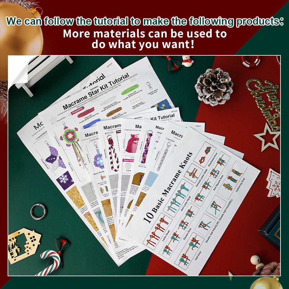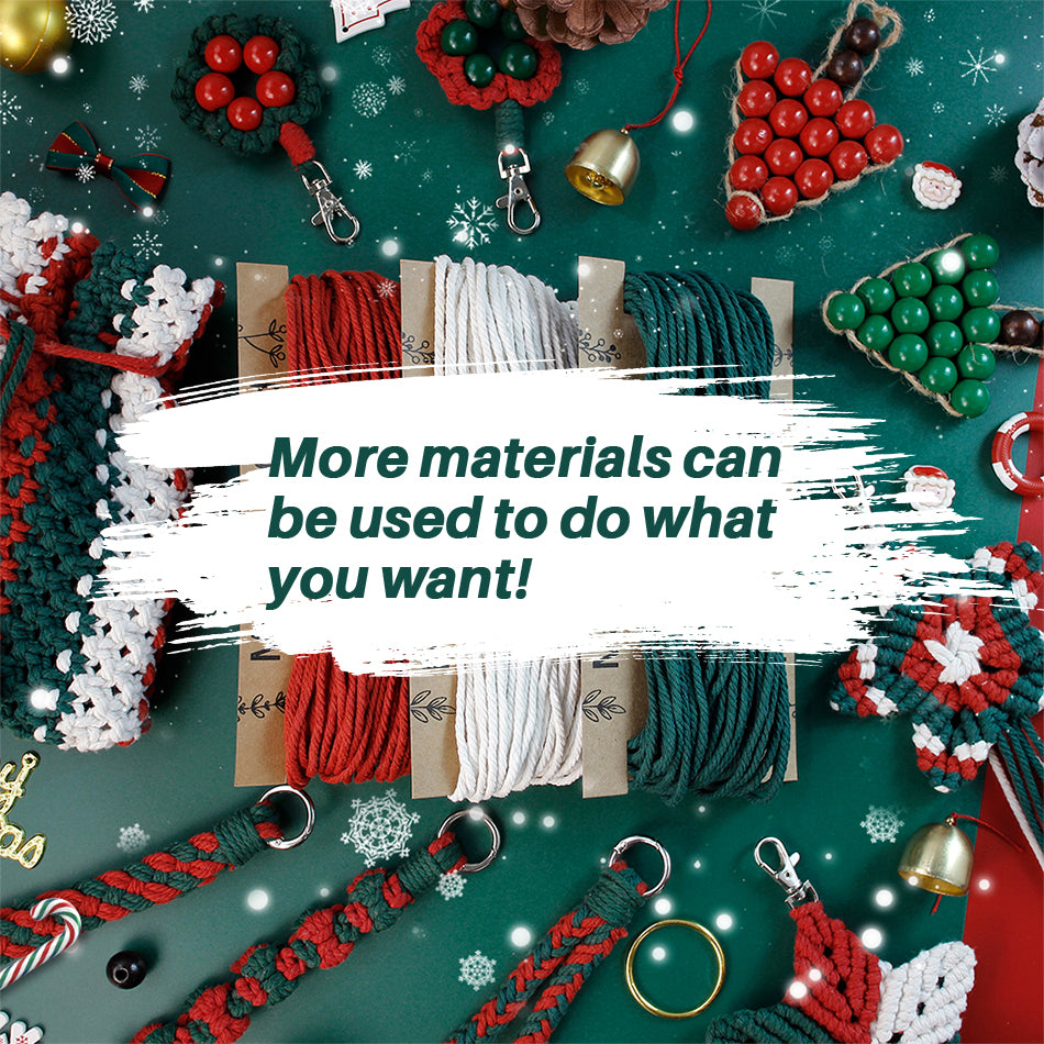 This Christmas Series 8-Piece Combo Weaving Kit (Macrame Kit) is a treasure choice for zero-based beginners and DIY lovers to create a Christmas atmosphere in one stop! Material details are super complete, fully meeting the production of 8 items: core threads include 3 colors of polyester fiber ropes (30m each, total 90m), colors suitable for Christmas themes, soft and tough without fading, stable after weaving, suitable for mini pouches, wristbands, Christmas ornaments and other different items; accessories cover all scenarios—4 silver lobster clasps + 3 spring clasps , wooden bead set (10pcs 12mm wooden beads + 2pcs 15mm large-hole wooden beads + 21pcs each of 16mm red/green wooden beads + 4pcs 16mm brown wooden beads, red and green are moist to show Christmas feeling, brown is suitable for ornament detail shaping, large-hole wooden beads are easy to thread and fix), 1 plastic needle (assists thread beading, no pricking for beginners), 1 bottle of 10ml white glue,pendants can decorate Christmas scenes and car windows, mini pouches can hold jewelry and lipsticks, wristbands prevent phone loss, covering home decoration and personal matching; Use it yourself to create an immersive Christmas atmosphere, and give it to friends to show handmade sincerity, with full cost-effectiveness!